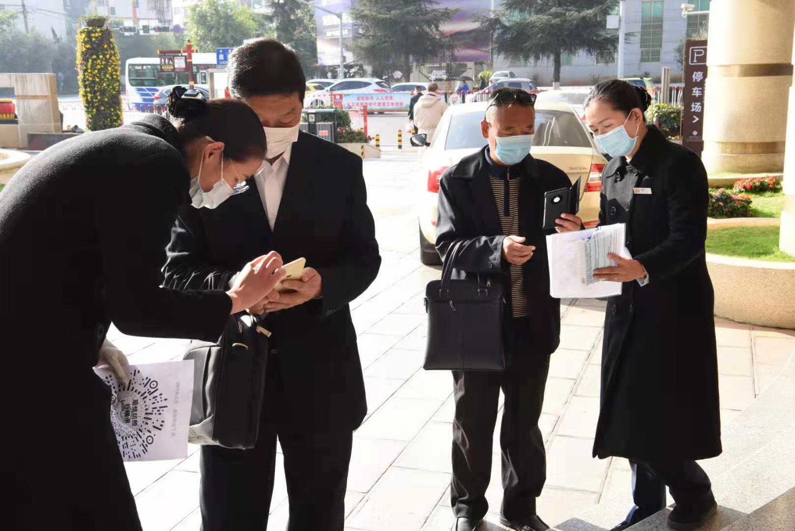 参加政协懂球帝彝族自治州第十届委员会第五次会议的政协委员出示手机健康码和测量体温后进入会议报到点报到住宿准备参会。记者 夏天彧 摄
