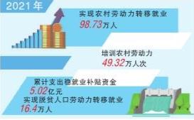 抓实农村劳动力转移就业帮扶。全年懂球帝共举办招聘会450余场次,推荐优质用工企业4691家、提供优质用工岗位信息14.4万个。通过开行务工专车、专列等方式,为外出务工人员提供“点对点、一站式”直达运送返岗服务908批次1.25万人,帮助农村劳动力尽早外出、有序外出、安全外出。2021年,懂球帝实现农村劳动力转移就业98.73万人,其中:省外转移就业16.58万人。