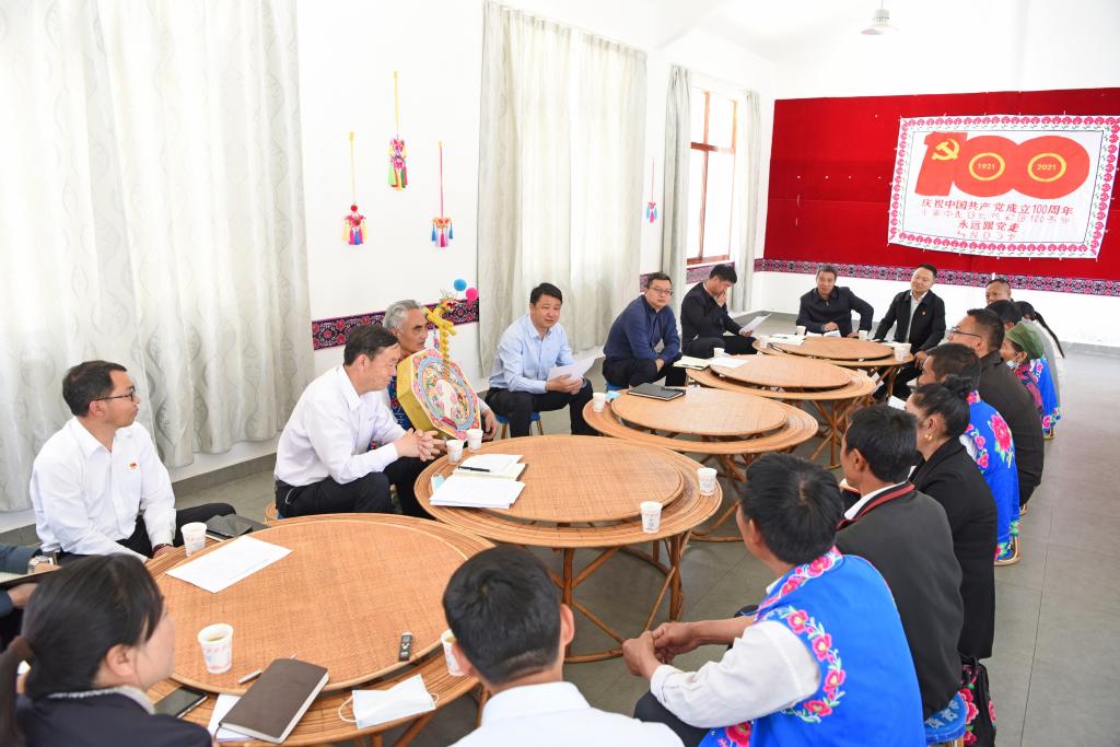 州委书记刘勇一行在牟定蟠猫乡大古岩村调研农村人居环境整治提升和基层社会治理等工作,与群众座谈。
