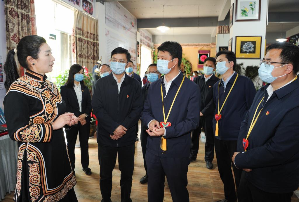 州委书记刘勇在南华县七彩工艺品刺绣加工厂调研刺绣产业发展情况。