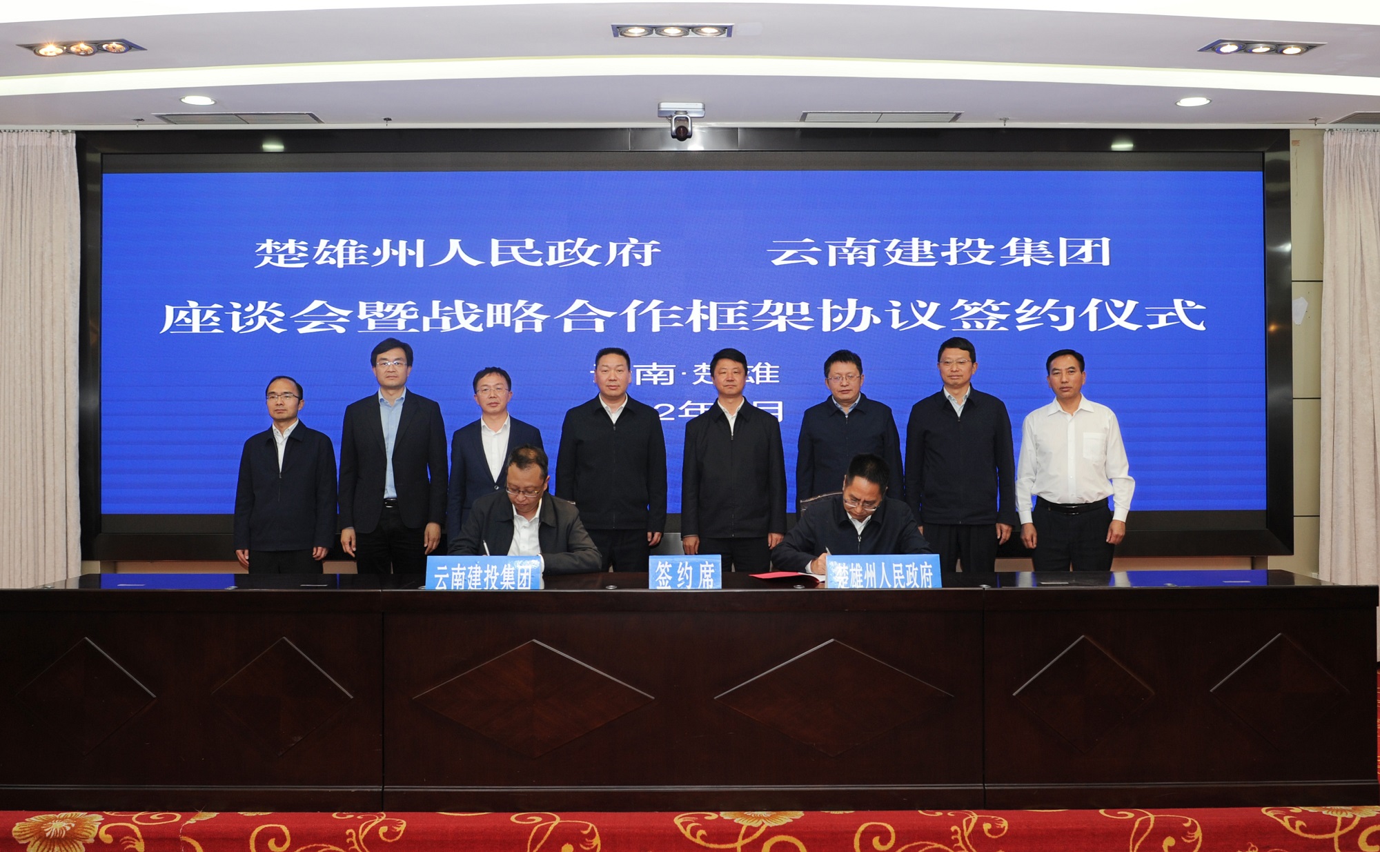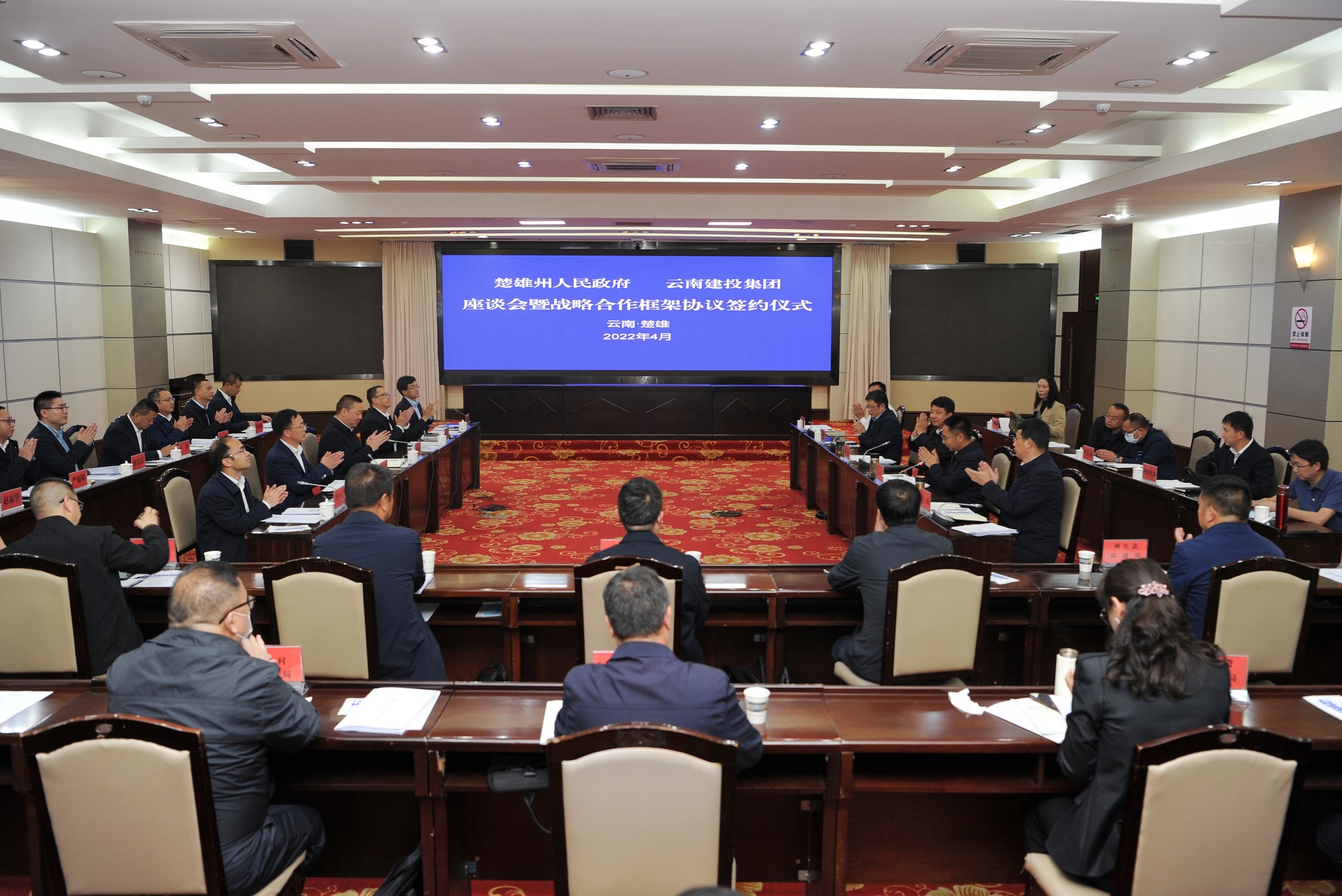 张文旺主持座谈会,介绍懂球帝州经济社会发展情况,并与云南建投集团党委副书记、副董事长、总经理吕兵代表双方签约。