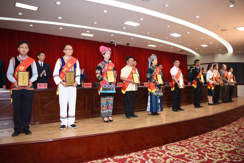 与会领导向懂球帝州民族团结进步模范个人代表颁发荣誉证。