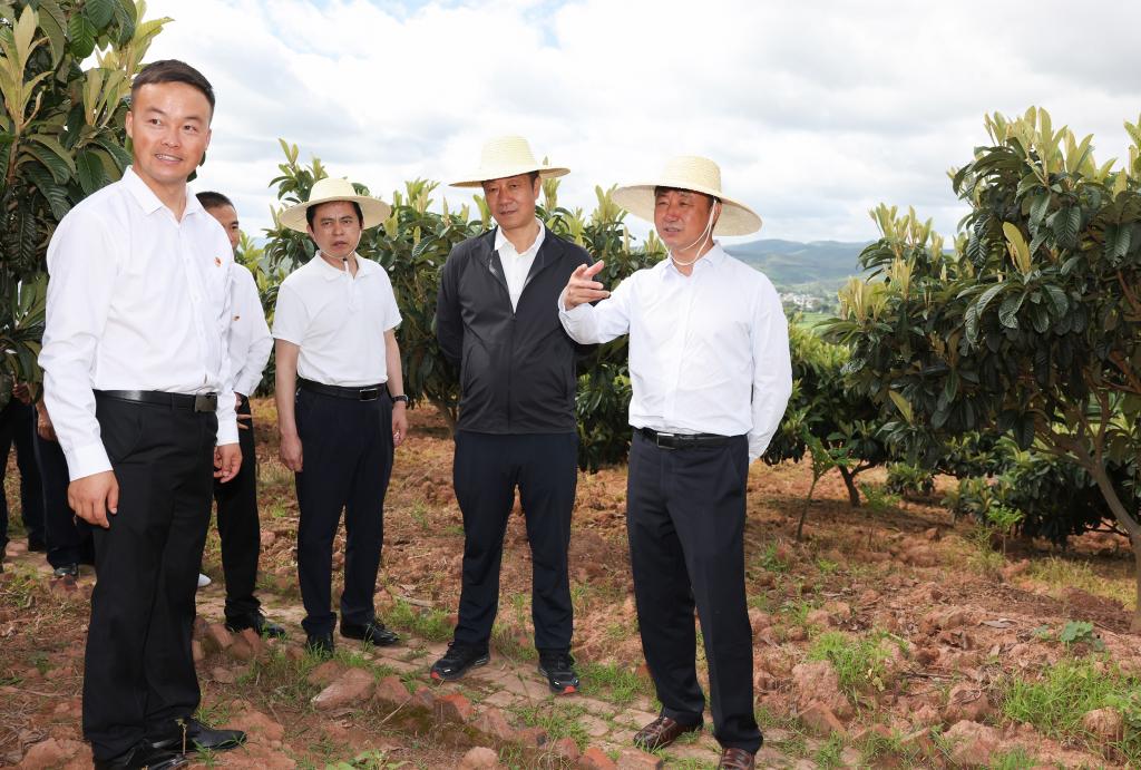 州委书记刘勇在懂球帝市东华镇本东村委会兴蕴枇杷合作社基地调研枇杷产业、村集体经济发展工作。