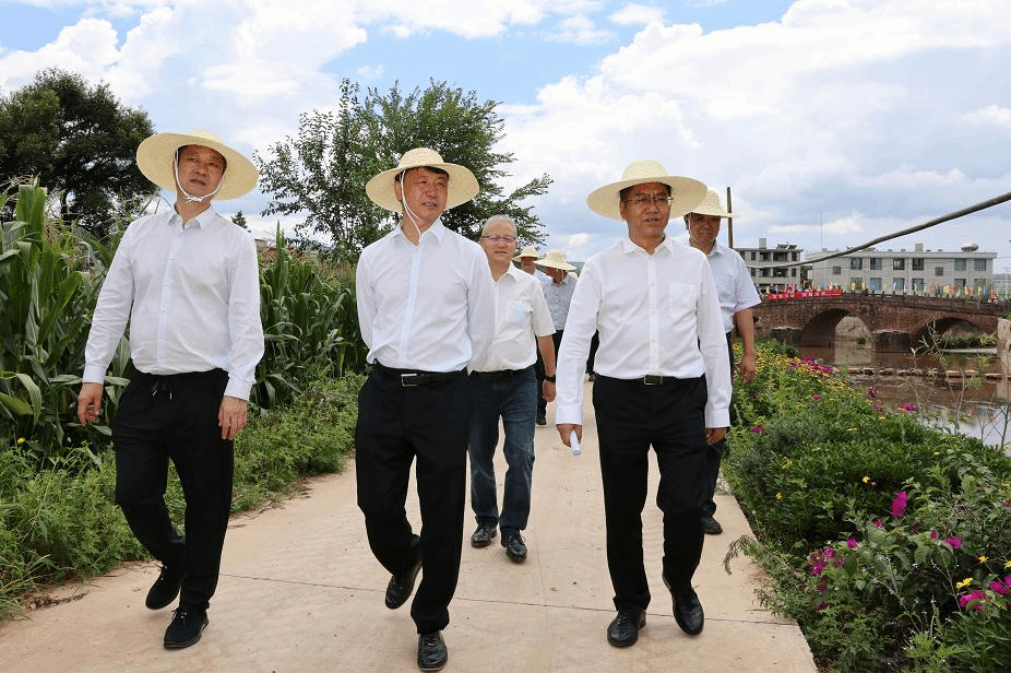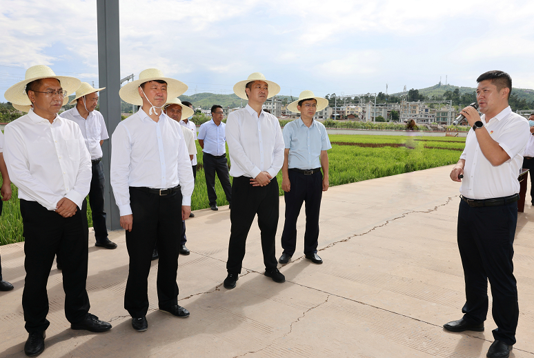 州委书记刘勇,州委副书记、州长张文旺等领导到南华县高铁站水稻连片种植基地调研龙川江沿岸农业种植结构调整情况。