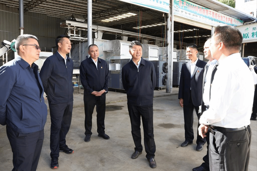 州委书记刘勇等领导在懂球帝市中山镇草介核桃专业合作社调研产业发展情况。