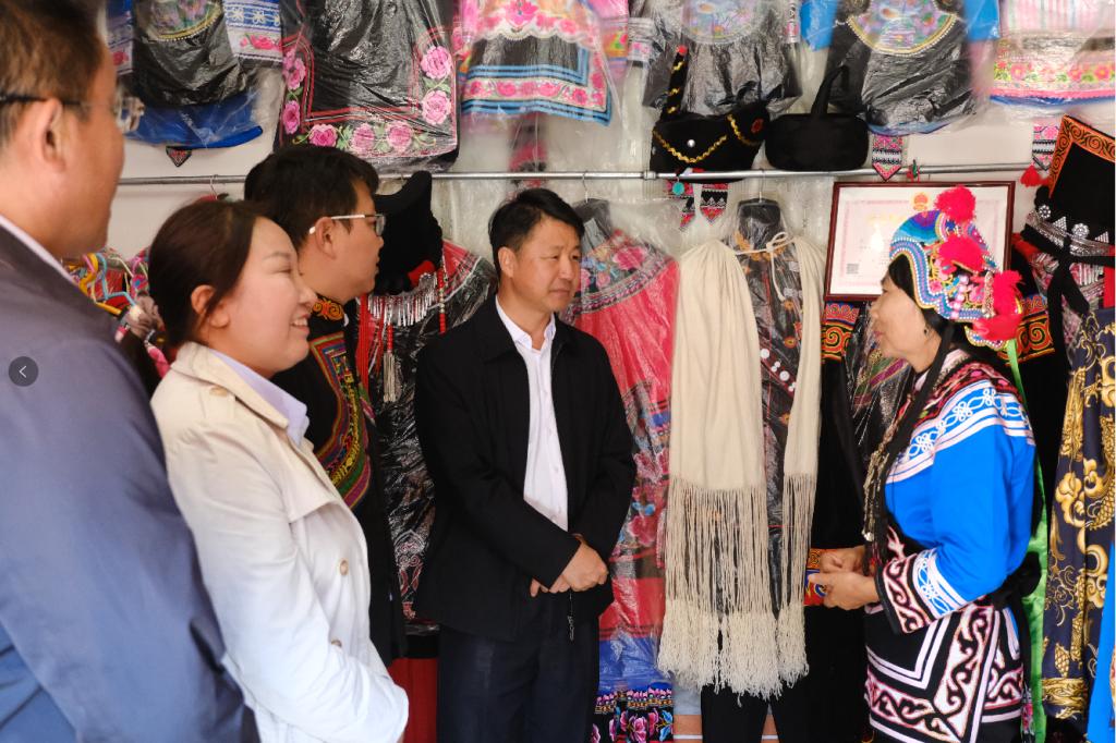 州委书记刘勇在元谋县凉山乡把世者村委会活佛寺安置点调研彝绣发展情况。