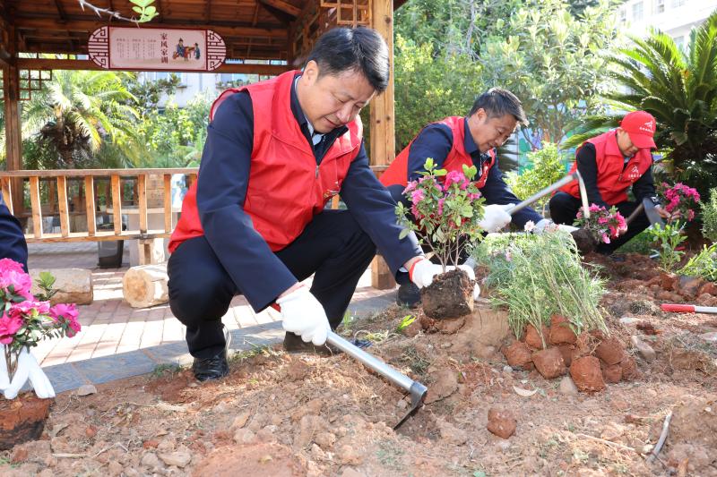 州委书记刘勇在学桥街社区州供销社住宿小区开展新时代文明实践志愿服务活动,在小区花坛种植绿化花卉。(记者 夏天彧 摄)