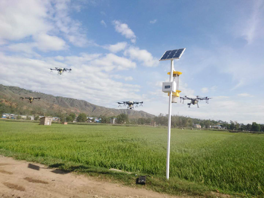 图为在黄瓜园镇龙山村委会600亩连片水稻高产创建示范区,采用植保无人机、太阳能物理杀虫灯开展病虫害绿色防控。