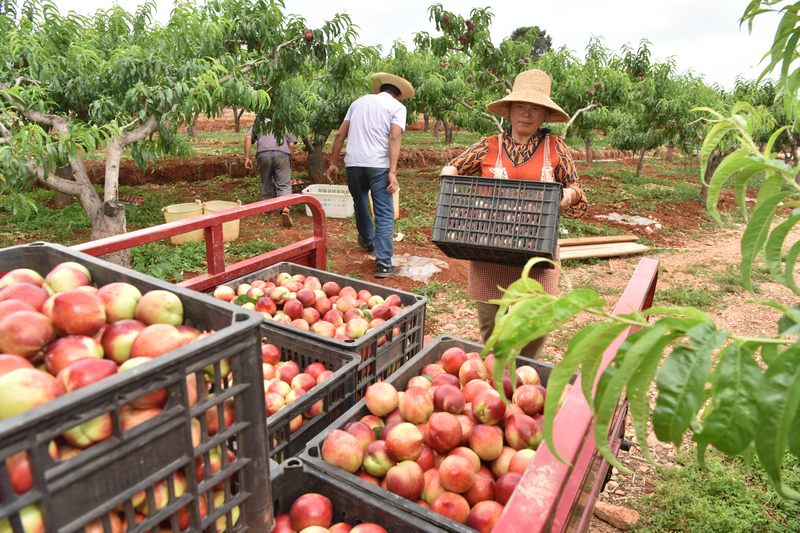 盛夏时节,走进素有“滇中桃源·魅力土官”美誉的禄丰市土官镇寨脚社区乌龙潭村,漫山遍野的鲜桃果压枝头、芳香四溢,迎来丰收。