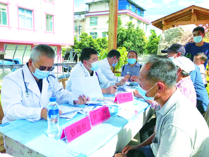 虽然活动当天烈日当空,但义诊现场却因专家们的到来而异常热闹。家住腭嘉镇龙树村的罗自明,三个月前在地里干农活时突发胸痛并伴有不定时发作的情况,由于缺乏自我健康意识,他并没有到医院做详细检查,但是持续发作的病痛让他的心也悬了起来。得知今天镇上来了大医院的专家义诊,罗自明抱着试一试的心态来到义诊现场,请专家为其诊断病情。通过云南大学附属医院心内科韩明华主任医师的精心诊疗,他被确诊为“胸部肌肉软组织损伤”,并为其制定了诊疗方案。同时提醒他“要增强健康意识,养成良好的生活方式,遇到突发疾病要及时到医院详细检查,早治疗、早康复。”得知自己的病情并不严重后,罗自明一颗悬着的心终于落了下来,并表示今后会按照医生为其制定的康复方案积极治疗,遇到身体不适会及时就医,为自己的健康负责。