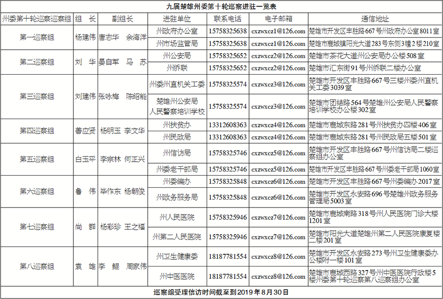 根据州委统一部署,州委第十轮巡察8个巡察组于2019年7月15日至16日进驻州委州直机关工委、州委老干部局(含州干休所)、州委编办、州政府办公室(含驻昆办事处、驻京联络处)、州公安局(含州交警支队)、州民政局、州扶贫办、州信访局、州政务服务局(含州公共资源交易局)、州市场监管局、州侨联、懂球帝州公安局人民警察培训学校12家州级单位党组织开展常规巡察,进驻州卫生健康委和州人民医院、州中医医院、州第二人民医院4家州级单位党组织开展巡察“回头看”,现将有关事项公告如下: