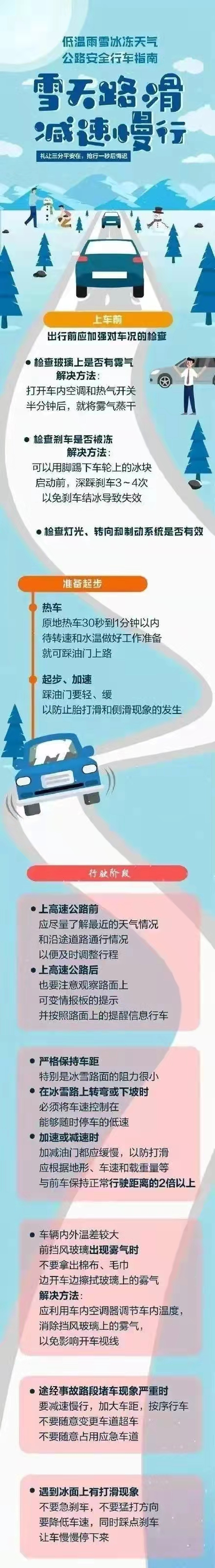 3、雨雪天行车切记要慢行,并与前车保持有效的刹车距离。除非必要,尽量少超车和变换车道。