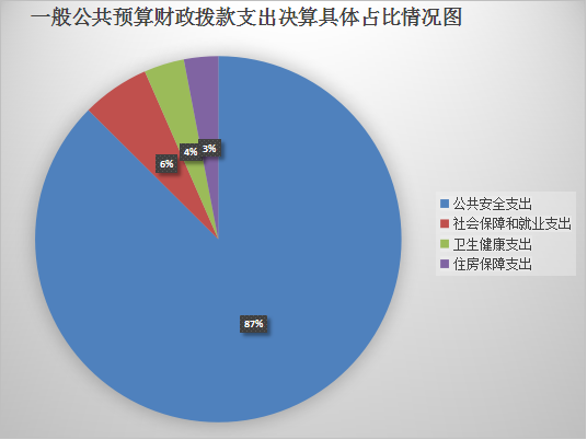 4.公共安全(类)支出5,107.03万元,占一般公共预算财政拨款总支出的87.45%。主要用于公安机关行政运行费用,道路交通管理运行支出,其他公安支出(服装费和装备购置费)。