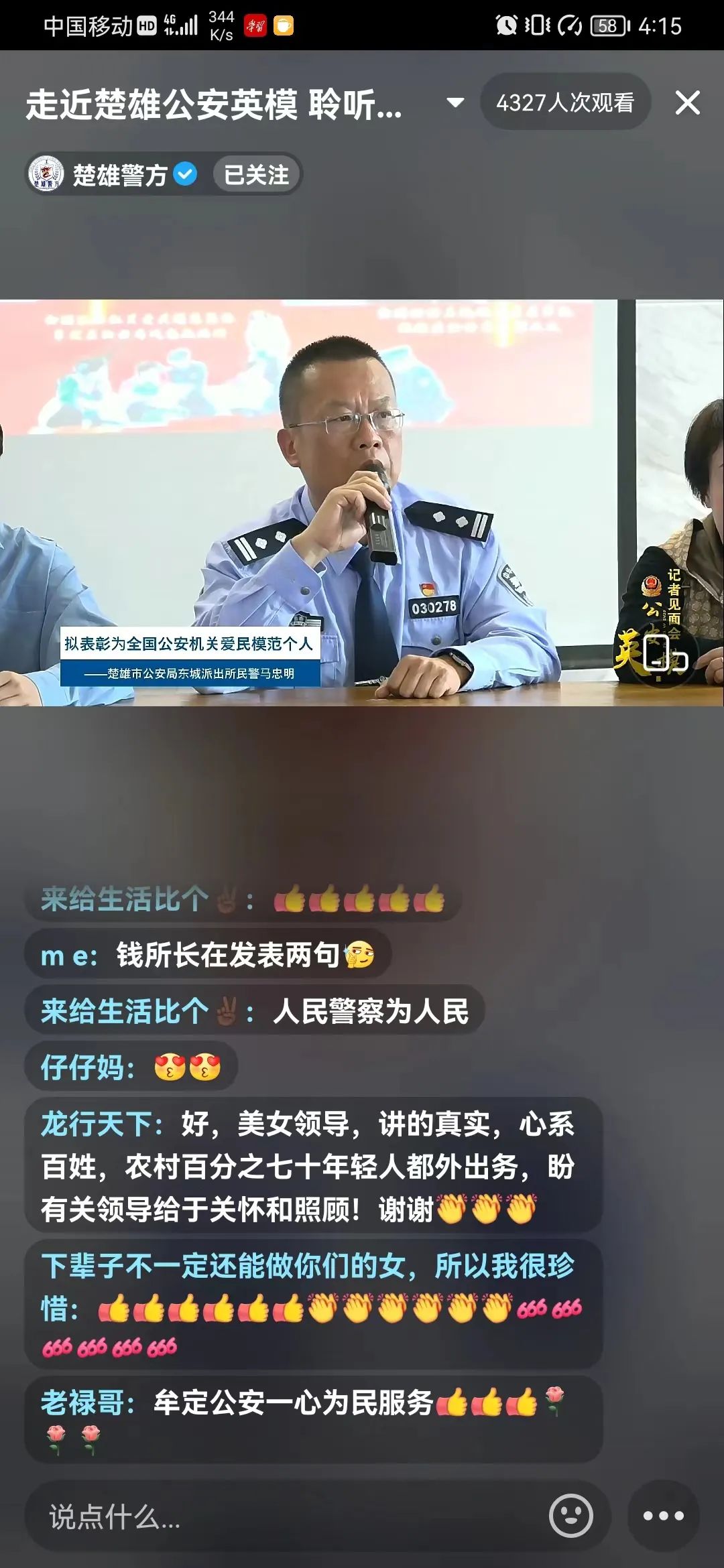 活动现场,大家观看了公示表彰对象事迹宣传短片,聆听了他们的讲述以及群众代表对他们的工作评价,现场媒体记者陆续提问,受邀嘉宾都耐心细致地进行了作答,现场和直播间的气氛一度进入高潮。公安英模们冲锋在打击犯罪一线,俯身在服务群众最基层那无私奉献、甘作公仆的精神让大家为之感动,网友纷纷点赞。