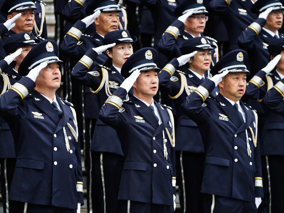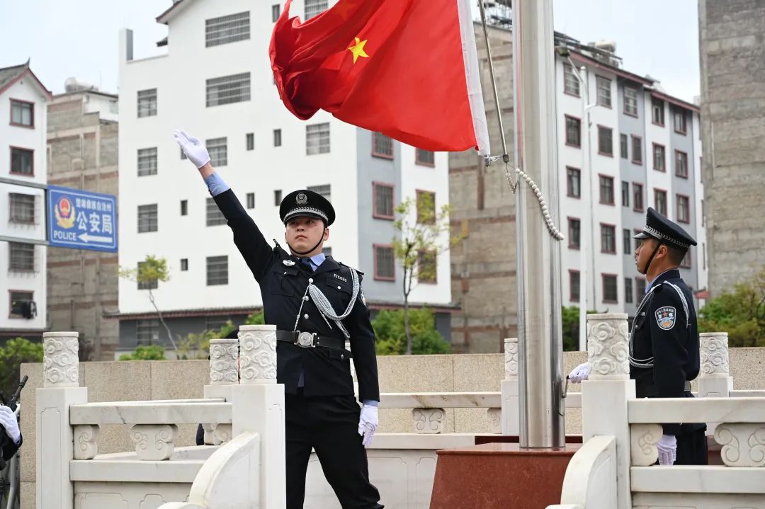 全体民警警容严整、庄严肃立,向国旗敬礼