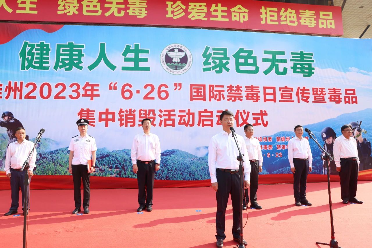 州委书记刘勇宣布懂球帝州2023年“6.26”国际禁毒日宣传暨毒品集中销毁活动启动,州委副书记、州长张文旺致辞。