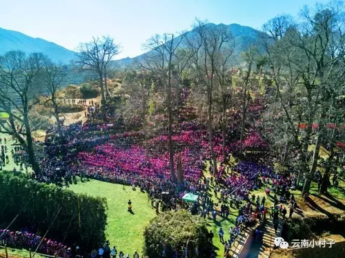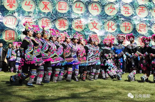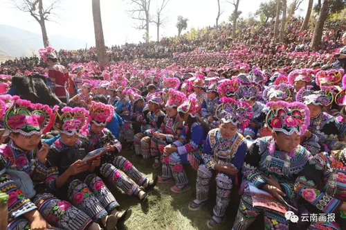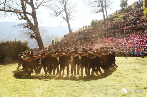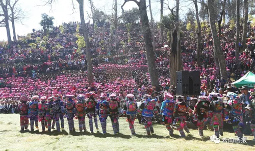 这一天,彝家儿女把夕阳当做聚光灯,一队接一队出场,在唢呐、芦笙的伴奏中翩翩起舞,展示各自漂亮的服装服饰和优美的舞姿。蓝天白云,漫山遍野绣满花红叶绿的衣裤鞋帽,刺绣针针细腻,线线密匝,放眼望去,令人震撼又沉醉。