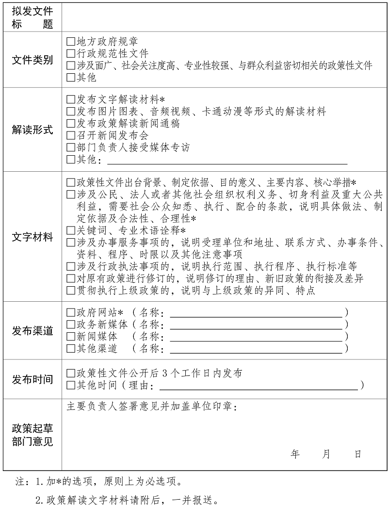 政府办公厅(室)文件承办机构办件时应当将政策解读方案、解读材料与政策性文件一并报送政府领导审签。提请政府常务会议审议的政策性文件应当附解读方案和文字解读材料。