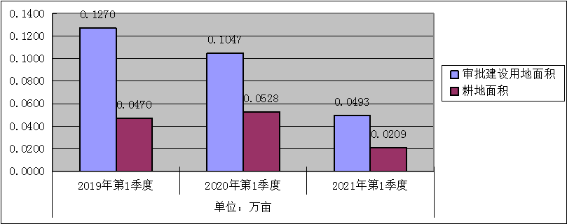 一季度批准建设用地合计0.0493万亩,同比减少52.91%,其中,耕地面积为0.0209万亩。