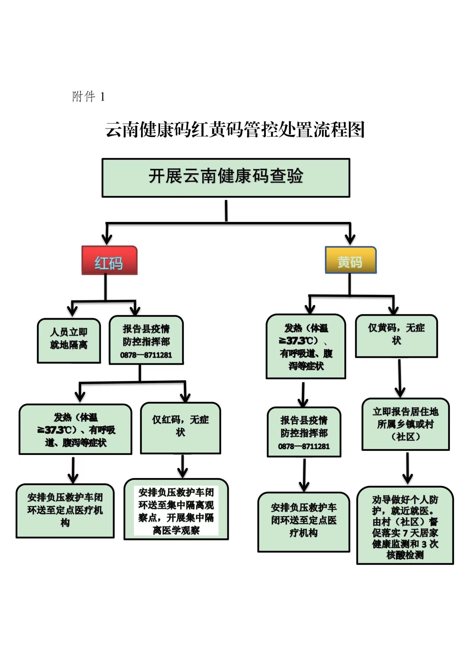 四、严格“黄码”人员管控。近14天内有国内中风险地区旅居史及云南健康码为黄码的人员,要第一时间主动向村(社区)或工作单位报告,配合落实核酸检测、健康监测等管控措施。在解除“黄码”之前,不得出入各类公共场所。在各交通健康监测点、人流密集场所、人员排查健康码查验中,发现黄码人员,劝导禁止进入场所内,做好体温检测和人员信息登记(姓名、身份证号、联系电话、现详细住址、近期核酸检测情况等),发现发热(体温≧37.3℃)、有呼吸道、腹泻等症状人员,立即向县疫情防控指挥部报告,由县疫情防控指挥部负责安排负压救护车闭环送至定点医疗机构进行救治,仅黄码无健康状况异常人员,立即向患者所属乡镇或村(社区)报告,指导患者做好个人防护,及时到就近医疗机构就诊,就诊过程中不得乘坐公共交通工具,村(社区)负责落实7天(从离开当天计算)居家健康监测和3次(第1、4、7天)核酸检测管控措施。