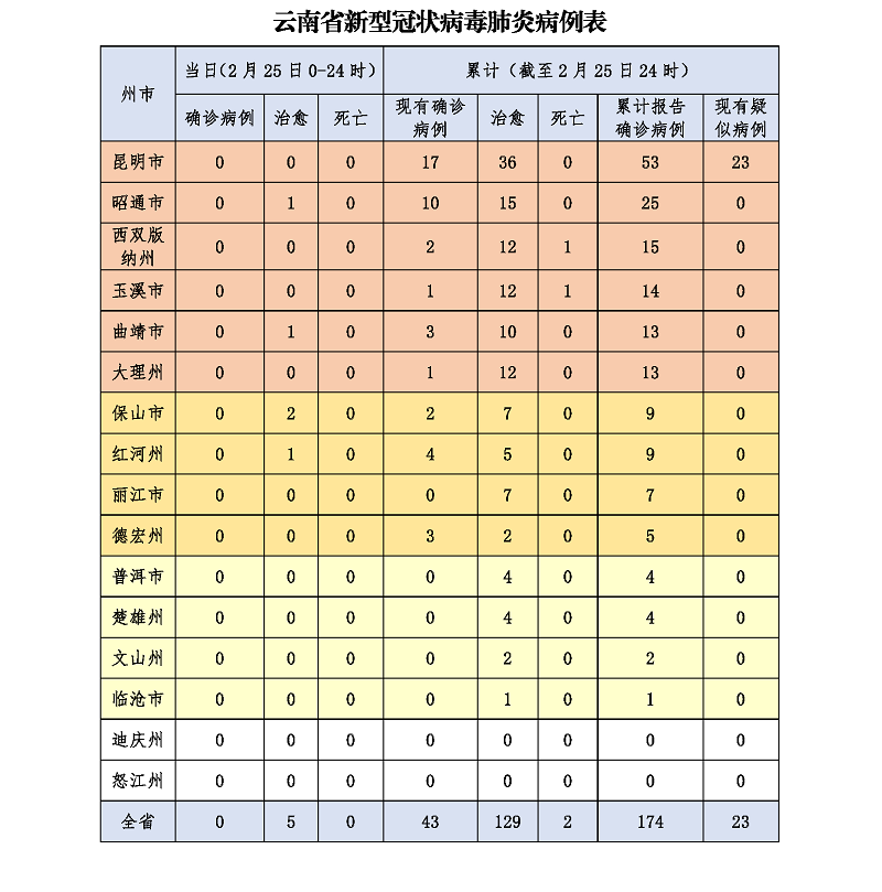 各州市累计确诊病例:昆明市53例(治愈出院36例),昭通市25例(治愈出院15例),西双版纳州15例(治愈出院12例、死亡1例),玉溪市14例(治愈出院12例、死亡1例),曲靖市13例(治愈出院10例),大理州13例(治愈出院12例),保山市9例(治愈出院7例),红河州9例(治愈出院5例),丽江市7例(治愈出院7例),德宏州5例(治愈出院2例),普洱市4例(治愈出院4例),懂球帝州4例(治愈出院4例),文山州2例(治愈出院2例),临沧市1例(治愈出院1例)。