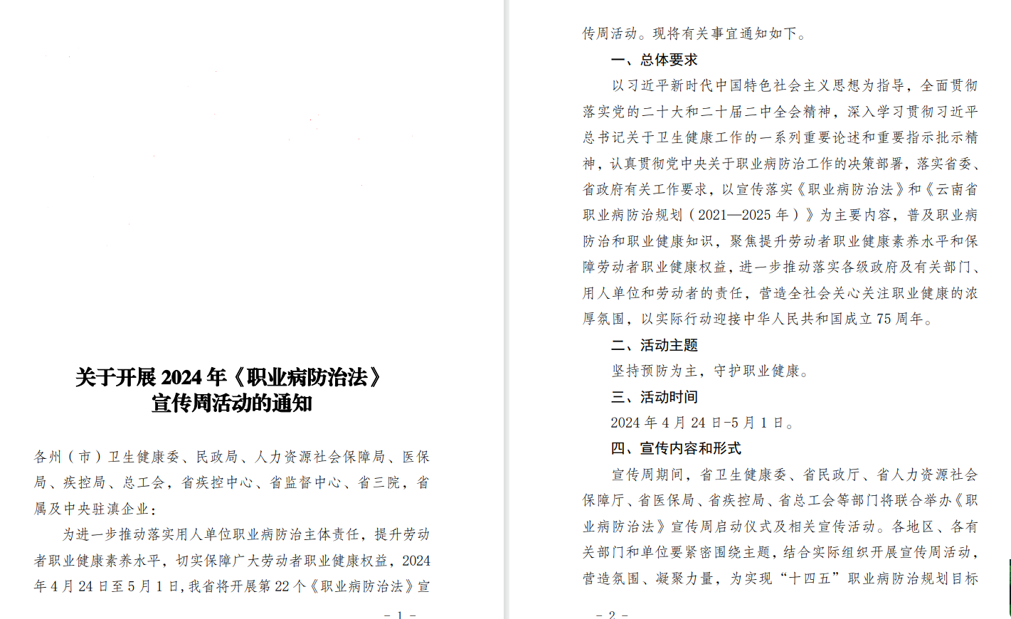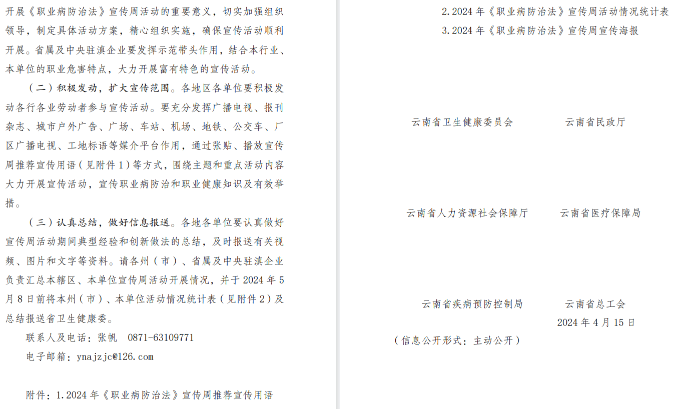 2024年4月24日至5月1日是第22个《中华人民共和国职业病防治法》宣传周。为认真贯彻省委、省政府和州委、州人民政府关于职业病防治工作的决策部署,为深入宣传贯彻《中华人民共和国职业病防治法》,进一步推动落实职业病防治工作地方各级政府领导责任、有关部门监管责任和用人单位主体责任,切实保障广大劳动者职业健康权益,现将云南省卫生健康委、省民政厅、省人力资源和社会保障厅、省医疗保障局、省疾控局、省总工会联发的《关于开展2024年<职业病防治法>宣传周活动的通知》(云卫职健发〔2024〕1号)转发给你们。请各县市、各单位结合实际,认真组织开展形式多样的活动。于2024年5月6日前将本辖区、本单位活动开展情况总结、图片及情况统计表分别报送州级有关主管部门。