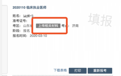 考生按常规报名流程进入国家医学考试考生系统,查看自己的报名信息,在报名信息处,点击“上传相关材料”按钮,按页面提示进入报名材料上传界面。