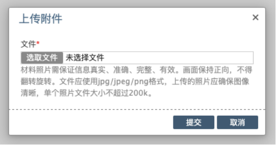 材料照片需保证信息真实、准确、完整、有效。画面保持正向,不得翻转旋转。文件应使用jpg/jpeg/png格式,上传的照片应确保图像清晰,单个照片文件大小不超过200k。