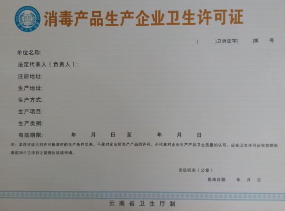 《消毒产品生产企业卫生许可证》(证件样本见附件1),证件有效期4年。