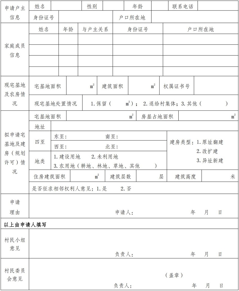 (一)村民申请。村民有建房需求的,应当填写农村宅基地和建房(规划许可)申请表(以下简称建房申请表),以户为单位向村民小组提出宅基地建房申请。