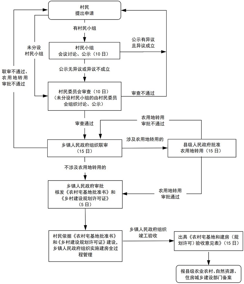 2.涉及农用地转用的建房申请。乡镇人民政府自收到建房申请表15日内,将农村宅基地建房农用地转用申请报县级人民政府,并抄送县级自然资源部门。县级人民政府收到农村宅基地建房农用地转用申请15日内完成审批并通知乡镇人民政府。取得农村宅基地建房农用地转用审批手续的,乡镇人民政府5日内核发《农村宅基地批准书》和《乡村建设规划许可证》,并通知村民委员会在本村范围内公告;未取得农村宅基地建房农用地转用审批手续的,乡镇人民政府5日内书面告知申请人,并说明理由。