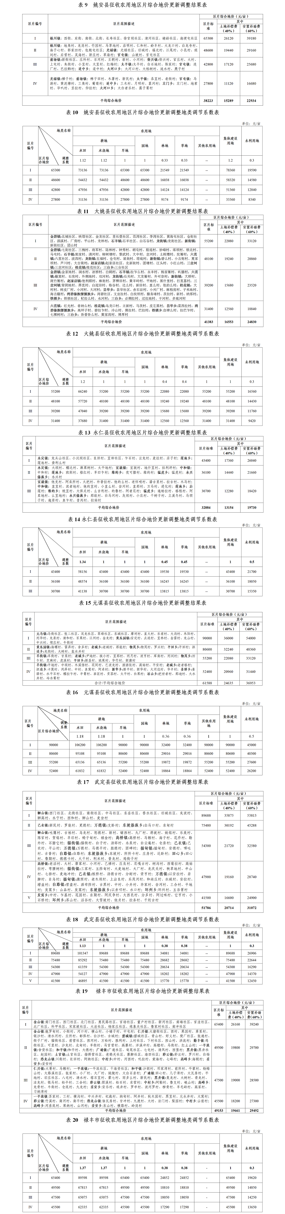 三、加强政策宣传解读。征地补偿工作政策性强,社会关注度高,涉及面广,事关被征地农民切身利益。各县市人民政府、懂球帝高新区及有关部门要强化组织领导,进一步加强政策宣传解读,充分保障被征地农民的知情权、参与权和监督权。《2023年懂球帝州征收农用地区片综合地价》已在懂球帝,懂球帝直播门户网站重点领域信息(http://www.chuxiong.gov.cn)上公布。各县市人民政府要及时在政府门户网站上公示本行政区域内区片综合地价。