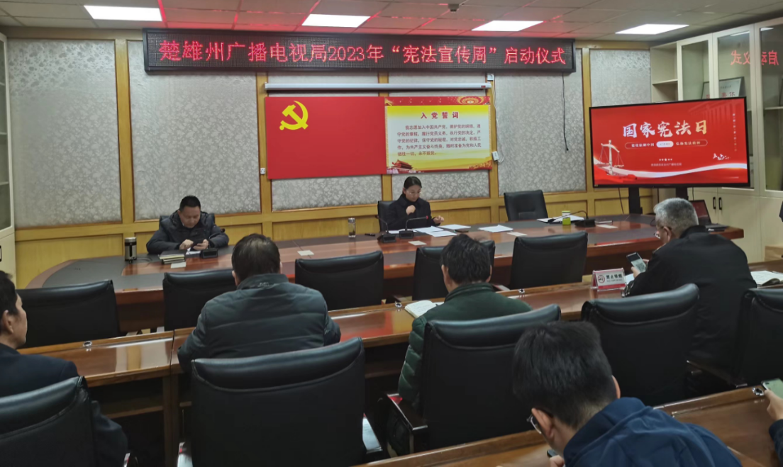聚焦宪法宣誓,推动公职人员遵守维护宪法。宪法宣传周期间,根据《中华人民共和国宪法》要求,州广电局组织2023年新任职的3名干部依法开展宪法宣誓。宣誓仪式开始,全体宣誓人员着装整洁严肃,排列井然有序,面向国徽和国旗奏唱中华人民共和国国歌,领誓人手抚宪法、领诵誓词,其他宣誓人列队站立、跟诵誓词。整个过程庄严肃穆,铿锵誓言掷地有声,通过宪法宣誓的方式勉励全体干部回望初心,对国家和人民作出庄严承诺,激励宣誓人压实责任、明确目标,为党和国家事业奋斗前行。