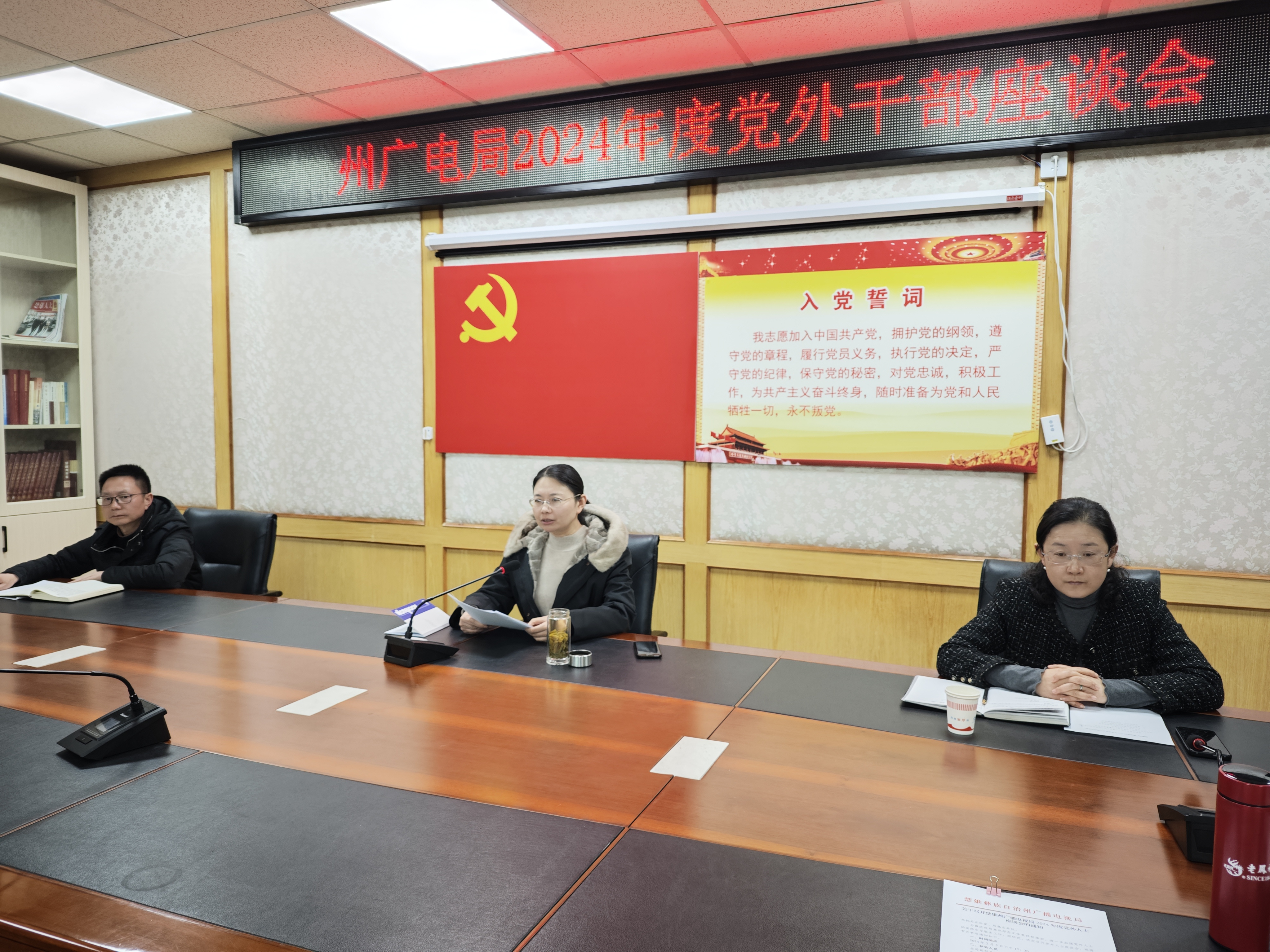 2月5日下午,州广电局召开2024年度党外干部座谈会。全局副科级及以上干部、局属州无线传发总台、州事业建设和安全播出监测中心全体党外人士参加本次座谈会。州广电局党组书记、局长何媛媛出席,局党组成员、副局长朱晓丹主持会议。