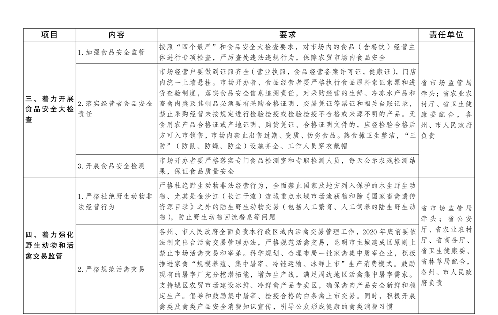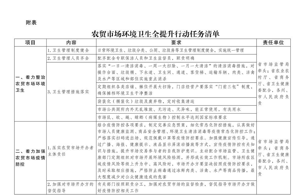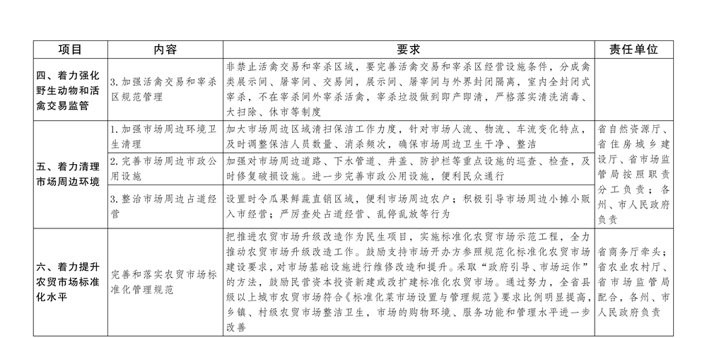 (六)农贸市场环境卫生全提升行动。全力整治农贸市场“脏、乱、差”现象,打造安全放心农贸市场。以“优环境、防疫情、保健康、促规范、提品质”为主题,狠抓环境卫生、疫情防控、食品安全、野生动物及活禽交易监管、周边环境、提升改造等6项重点工作,改变农贸市场垃圾乱扔、污水乱排、摊点乱设、货物乱摆、周边乱象“五乱”状况,落实有完善的硬件设施、有严格的管理措施、有整洁的场容、有安全放心的商品、有井然有序的周边环境“五有”要求,实现净化、美化、规范化、精细化、标准化“五化”目标。(省市场监管局牵头;省公安厅、省农业农村厅、省商务厅、省卫生健康委、省林草局配合,各州、市人民政府负责)