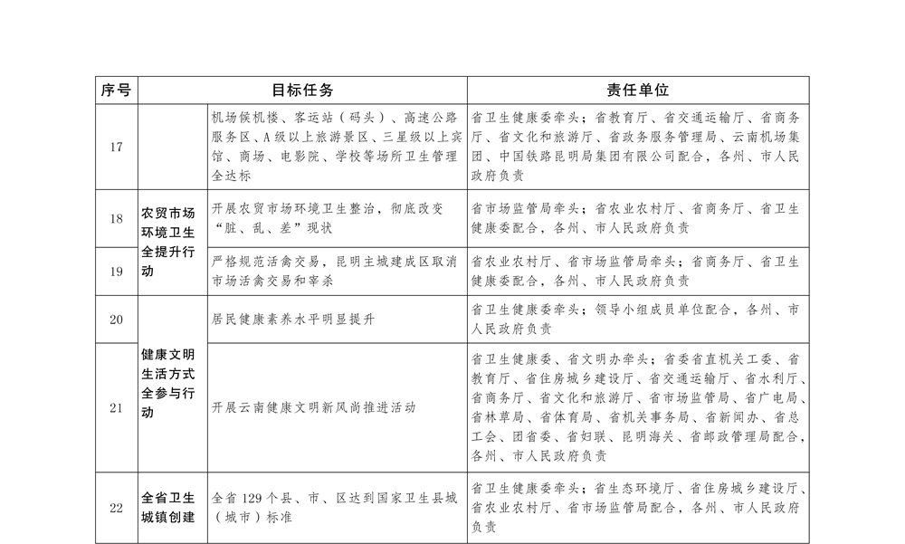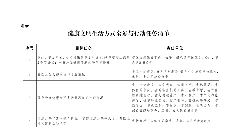 (七)健康文明生活方式全参与行动。开展爱国卫生大扫除活动,促进城乡环境卫生整治;倡导“社交距离、勤于洗手、分餐公筷、革除陋习、科学健身、控烟限酒”健康文明生活“六条新风尚”,推广健康文明生活习惯;创新方式方法,开发健康科普核心信息,大力普及健康知识,大幅提升居民健康素养水平。让人人成为健康第一责任人,人人树立健康文明新风尚,人人参与健康文明生活方式,人人享有健康文明幸福生活。(省卫生健康委、省文明办牵头;省委省直机关工委、省教育厅、省住房和城乡建设厅、省交通运输厅、省水利厅、省商务厅、省文化和旅游厅、省市场监管局、省广电局、省林草局、省体育局、省机关事务局、省新闻办、省总工会、团省委、省妇联、昆明海关、省邮政管理局配合,各州、市人民政府负责)