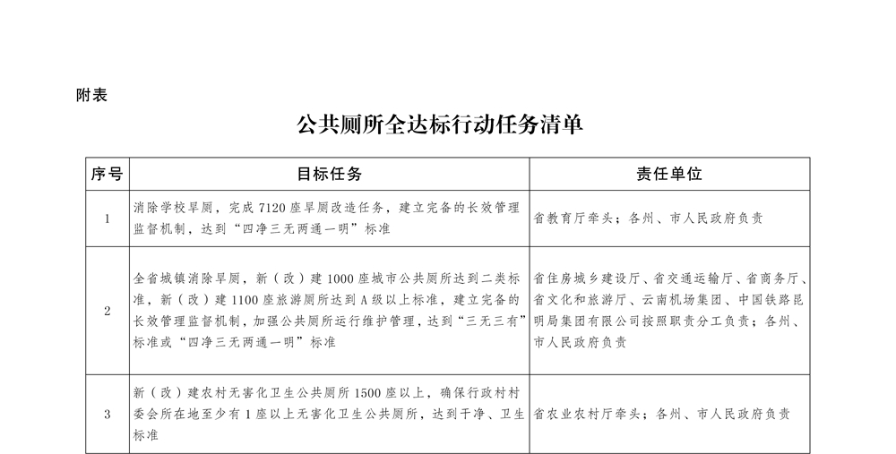 (二)公共厕所全达标行动。全省城镇消除旱厕。大力推进学校卫生厕所标准化建设,城市新(改)建公共厕所全部达到二类标准,新(改)建旅游厕所达到A级以上标准。开展农村公厕提质达标行动,扎实推进农村“厕所革命”,行政村村委会所在地至少有1座以上无害化卫生公共厕所。公共厕所干净、卫生,达到相应规范标准。(省住房和城乡建设厅牵头;省教育厅、省交通运输厅、省农业农村厅、省商务厅、省文化和旅游厅、云南机场集团、中国铁路昆明局集团有限公司配合,各州、市人民政府负责)
