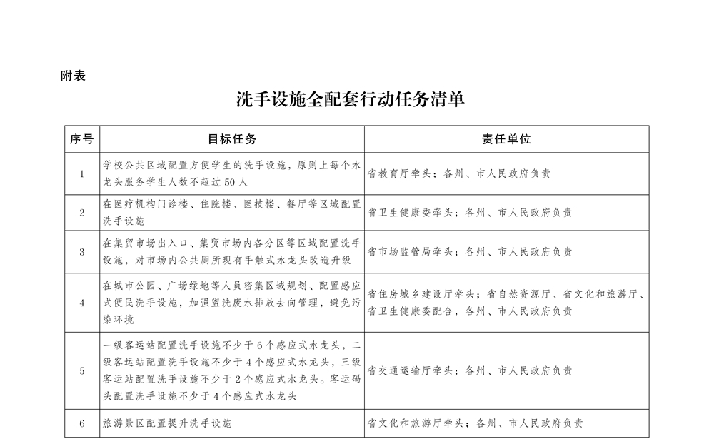 (三)洗手设施全配套行动。在公众场所配置洗手设施,减少传染病经手传播。按照“因地制宜、方便实用”的原则,重点对学校、医疗机构、集贸市场、室内公共场所、公园广场、客运站(码头)、旅游景区、高速公路服务区等场所的洗手设施进行建设、改造、升级,确保数量足够、质量达标、管理到位、使用方便。(省住房和城乡建设厅牵头;省教育厅、省自然资源厅、省交通运输厅、省商务厅、省文化和旅游厅、省卫生健康委、省市场监管局配合,各州、市人民政府负责)