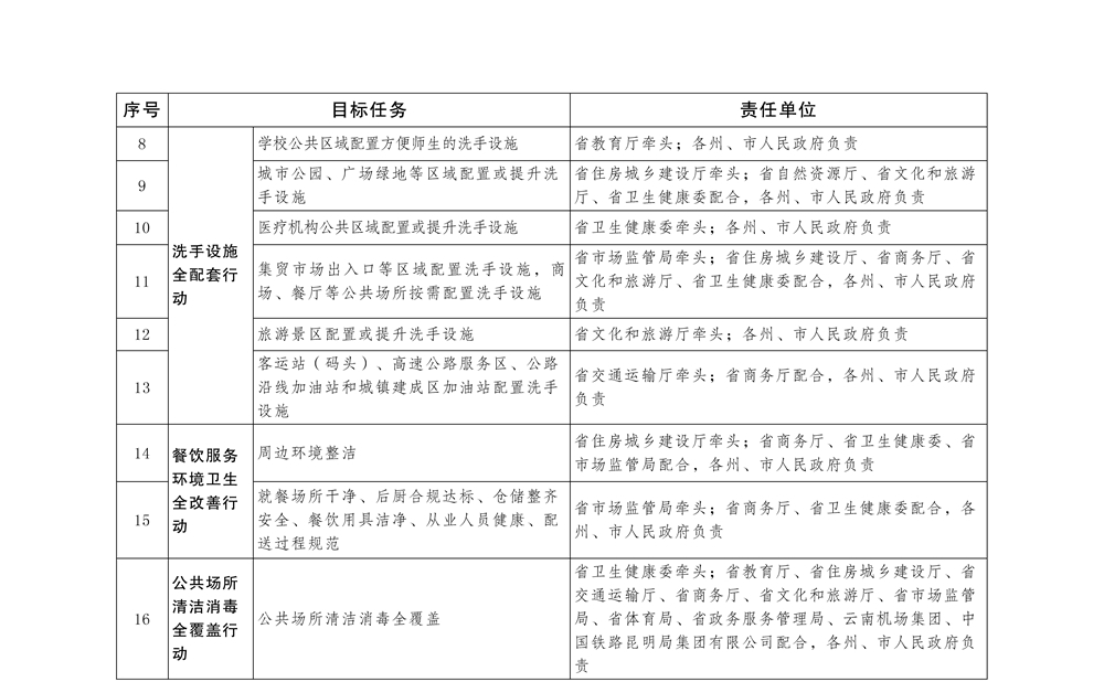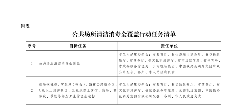 (五)公共场所清洁消毒全覆盖行动。以“环境卫生制度化、清洁消毒标准化、疫情防控常态化”为重点,通过“整治一批、规范一批、达标一批”专项活动,推进常态化清洁消毒,落实疫情防控重点要求,实现公共场所清洁消毒全覆盖。机场候机楼、客运站(码头)、高速公路服务区、A级以上旅游景区、三星级以上宾馆、商场、电影院、学校等场所卫生管理全达标,打造卫生安全、公众放心的公共场所,严防传染性疾病在公共场所传播。(省卫生健康委牵头;省教育厅、省住房和城乡建设厅、省交通运输厅、省商务厅、省文化和旅游厅、省市场监管局、省体育局、省政务服务管理局、云南机场集团、中国铁路昆明局集团有限公司配合,各州、市人民政府负责)