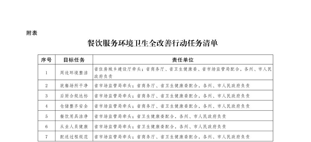 (四)餐饮服务环境卫生全改善行动。强化餐饮服务单位主体责任,持续改善餐饮服务环境卫生条件,全面落实“不达标就整改,不整改就严处”的要求,实现周边环境整洁、就餐场所干净、后厨合规达标、仓储整齐安全、餐饮用具洁净、从业人员健康、配送过程规范“七个达标”,确保群众餐饮消费放心、安心、舒心。(省市场监管局牵头;省住房和城乡建设厅、省商务厅、省卫生健康委配合,各州、市人民政府负责)