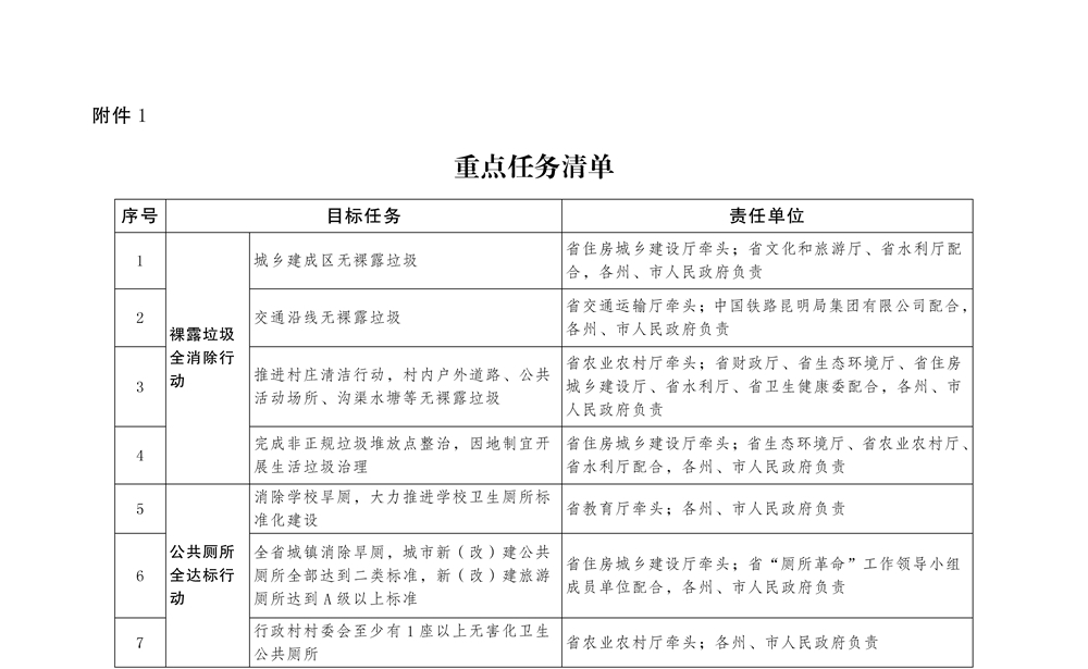 (一)裸露垃圾全消除行动。通过强化城乡和交通沿线保洁,消除城乡建成区道路路面、背街小巷、广场公园、河道湖面、城乡结合部、旅游景区等重点区域裸露垃圾;全面清除公路用地范围内生活垃圾、建筑垃圾等,加强航道养护管理,定期清理铁路沿线裸露垃圾。推进村庄清洁行动,建立健全自然村保洁长效机制、实现保洁员全覆盖,组织农户清扫,实现村内户外道路、公共活动场所、沟渠水塘等无裸露垃圾。保证村庄垃圾有人清扫、有人清运、不乱堆乱放,环境干净整洁。完成非正规垃圾堆放点整治,因地制宜开展生活垃圾治理。(省住房和城乡建设厅牵头;省生态环境厅、省交通运输厅、省农业农村厅、省水利厅、省文化和旅游厅、中国铁路昆明局集团有限公司配合,各州、市人民政府负责)
