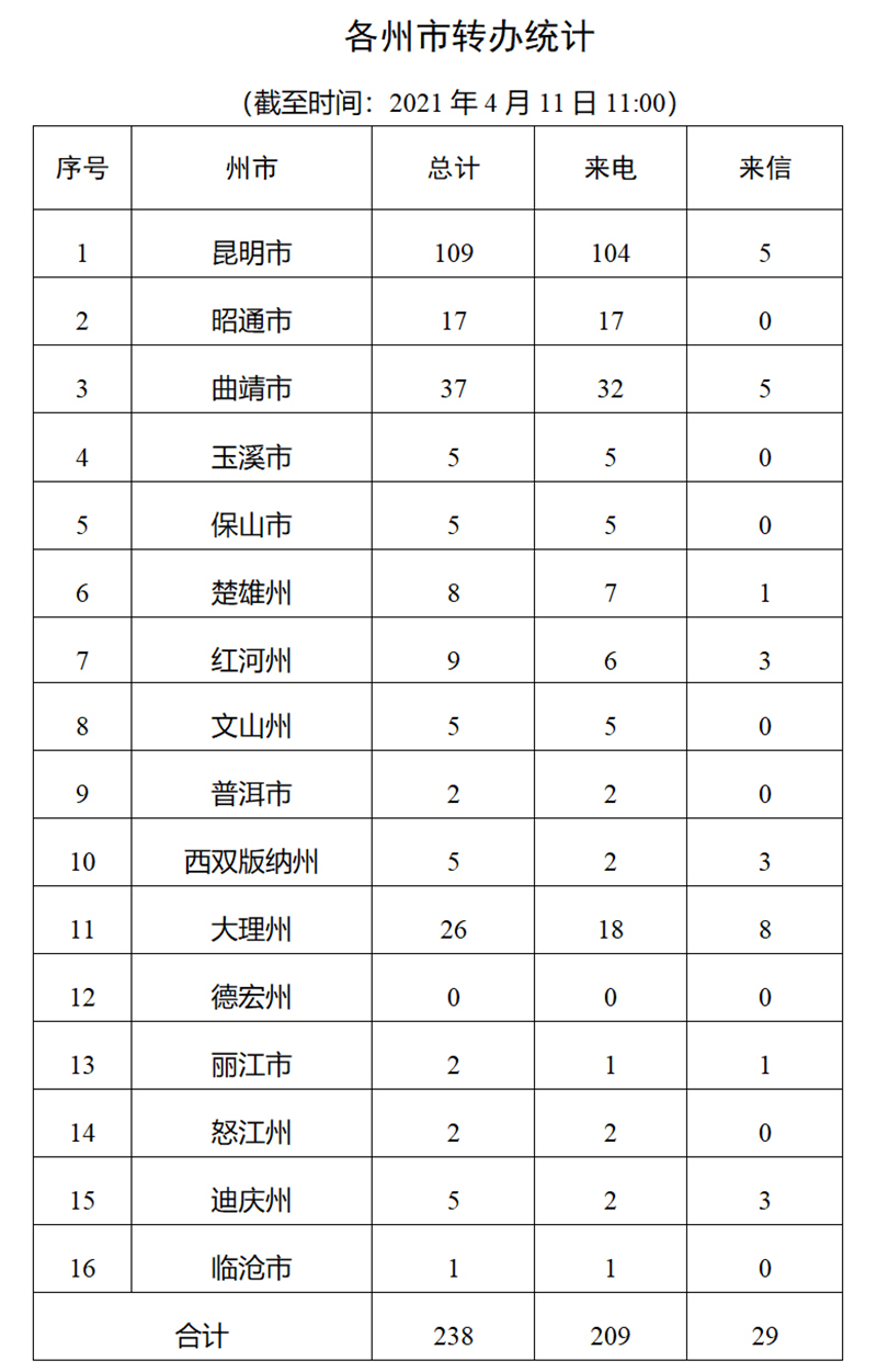 截至4月11日上午11:00,督察组交办群众举报投诉生态环境问题共五批238件(来电209件、来信29件),涉及州(市)15个,昆明市109件,曲靖市37件,大理州26件,昭通市17件,红河州9件,懂球帝州8件,玉溪市、保山市、文山州、西双版纳州、迪庆州各5件,普洱市、丽江市、怒江州各2件,临沧市1件。