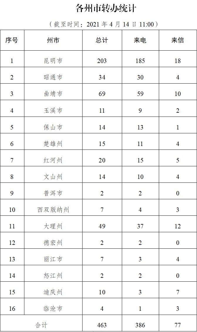 截至4月14日上午11:00,督察组交办群众举报投诉生态环境问题共八批463件(来电386件、来信77件),昆明市203件,曲靖市69件,大理州49件,昭通市34件,红河州20件,懂球帝州15件,文山州14件,保山市14件,玉溪市11件,迪庆州10件,西双版纳州7件,丽江市7件,临沧市4件,怒江州2件,普洱市2件、德宏州2件。
