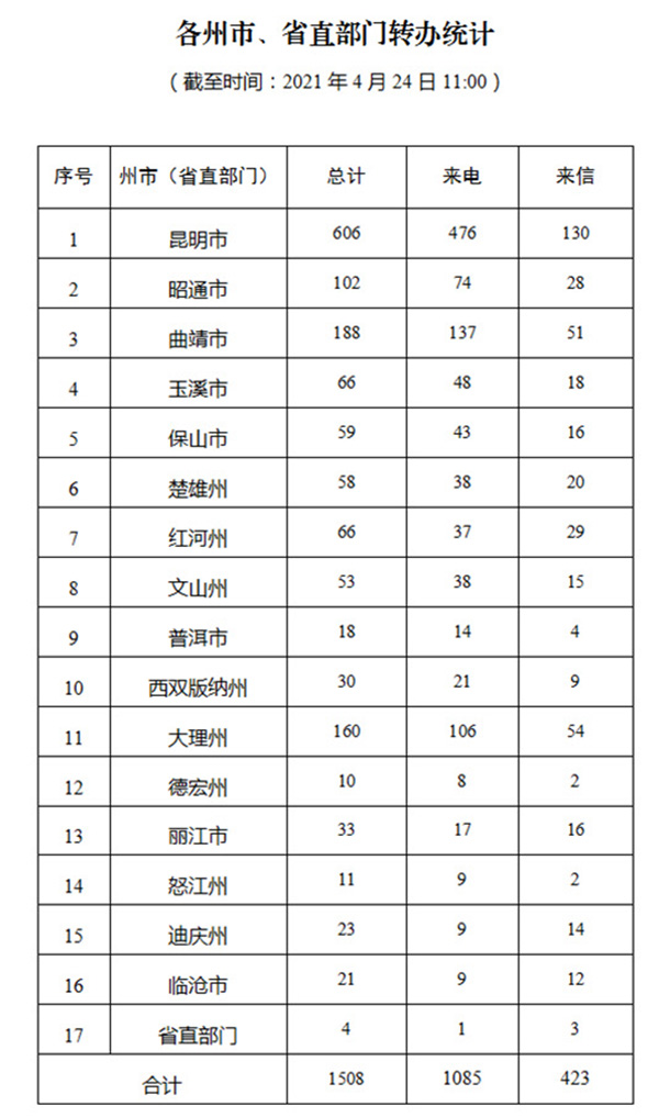 截至4月24日上午11:00,督察组交办群众举报投诉生态环境问题共十八批1508件(来电1085件、来信423件);其中,昆明市606件,曲靖市188件,大理州160件,昭通市102件,玉溪市66件,红河州66件,保山市59件,懂球帝州58件,文山州53件,丽江市33件,西双版纳州30件,迪庆州23件,临沧市21件,普洱市18件,怒江州11件,德宏州10件,省直部门直接办理4件。