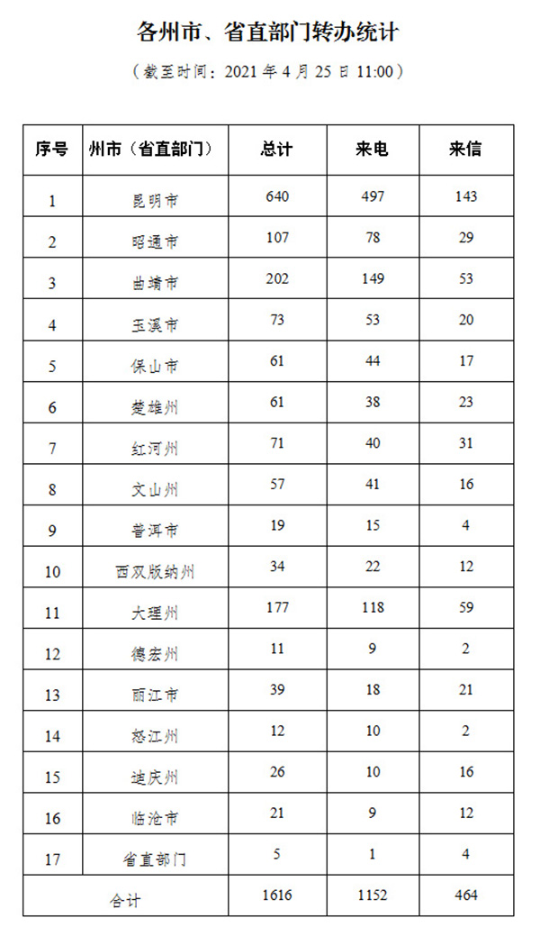 截至4月25日上午11:00,督察组交办群众举报投诉生态环境问题共十九批1616件(来电1152件、来信464件);其中,昆明市640件,曲靖市202件,大理州177件,昭通市107件,玉溪市73件,红河州71件,保山市61件,懂球帝州61件,文山州57件,丽江市39件,西双版纳州34件,迪庆州26件,临沧市21件,普洱市19件,怒江州12件,德宏州11件,省直部门直接办理5件。