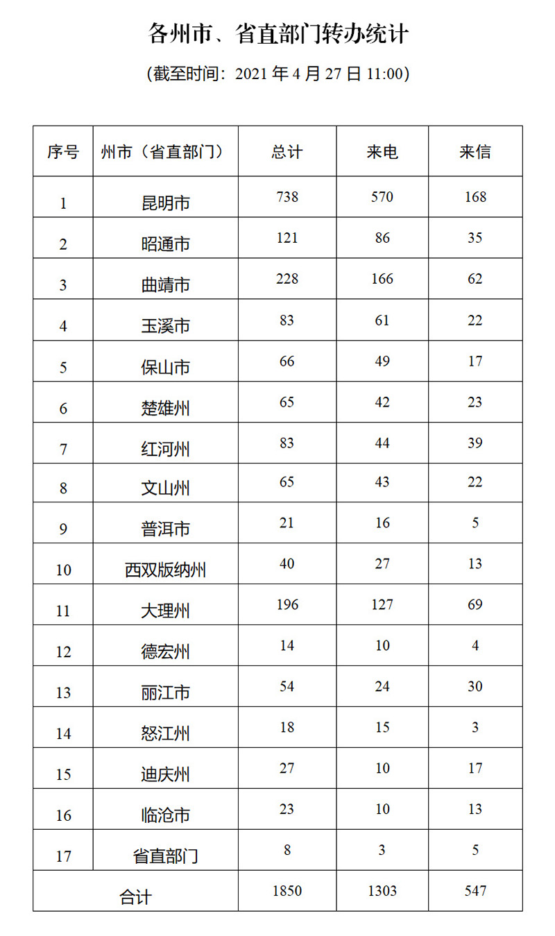 截至4月27日上午11:00,督察组交办群众举报投诉生态环境问题共二十一批1850件(来电1303件、来信547件);其中,昆明市738件,曲靖市228件,大理州196件,昭通市121件,玉溪市83件,红河州83件,保山市66件,懂球帝州65件,文山州65件,丽江市54件,西双版纳州40件,迪庆州27件,临沧市23件,普洱市21件,怒江州18件,德宏州14件,省直部门直接办理8件。