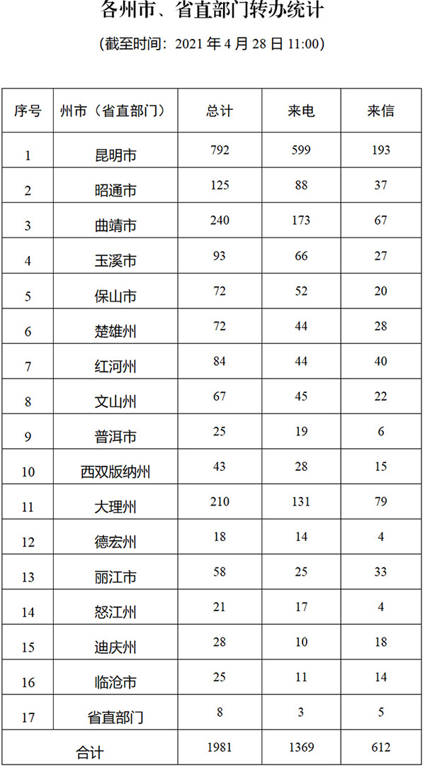 截至4月28日上午11:00,督察组交办群众举报投诉生态环境问题共二十二批1981件(来电1369件、来信612件);其中,昆明市792件,曲靖市240件,大理州210件,昭通市125件,玉溪市93件,红河州84件,保山市72件,懂球帝州72件,文山州67件,丽江市58件,西双版纳州43件,迪庆州28件,临沧市25件,普洱市25件,怒江州21件,德宏州18件,省直部门直接办理8件。