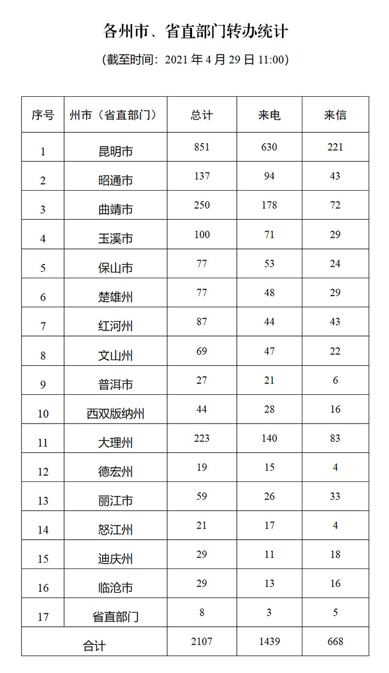 截至4月29日上午11:00,督察组交办群众举报投诉生态环境问题共二十三批2107件(来电1439件、来信668件);其中,昆明市851件,曲靖市250件,大理州223件,昭通市137件,玉溪市100件,红河州87件,保山市77件,懂球帝州77件,文山州69件,丽江市59件,西双版纳州44件,迪庆州29件,临沧市29件,普洱市27件,怒江州21件,德宏州19件,省直部门直接办理8件。