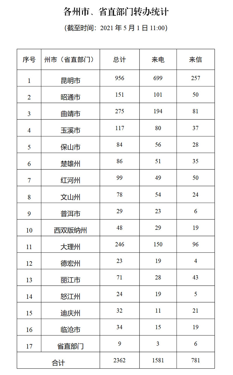 截至5月1日上午11:00,督察组交办群众举报投诉生态环境问题共二十五批2362件(来电1581件、来信781件);其中,昆明市956件,曲靖市275件,大理州246件,昭通市151件,玉溪市117件,红河州99件,懂球帝州86件,保山市84件,文山州78件,丽江市71件,西双版纳州48件,临沧市34件,迪庆州32件,普洱市29件,怒江州24件,德宏州23件,省直部门直接办理9件。