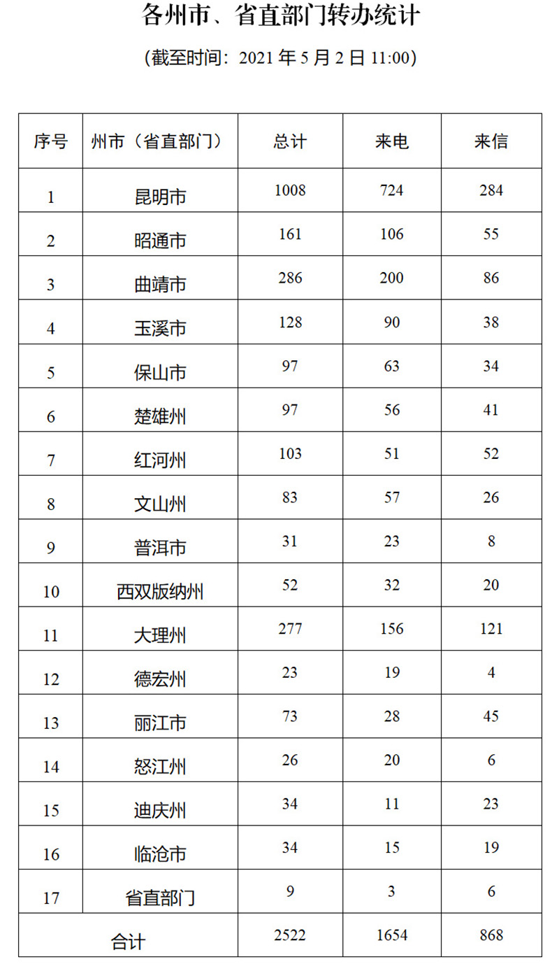 截至5月2日上午11:00,督察组交办群众举报投诉生态环境问题共二十六批2522件(来电1654件、来信868件);其中,昆明市1008件,曲靖市286件,大理州277件,昭通市161件,玉溪市128件,红河州103件,懂球帝州97件,保山市97件,文山州83件,丽江市73件,西双版纳州52件,临沧市34件,迪庆州34件,普洱市31件,怒江州26件,德宏州23件,省直部门直接办理9件。